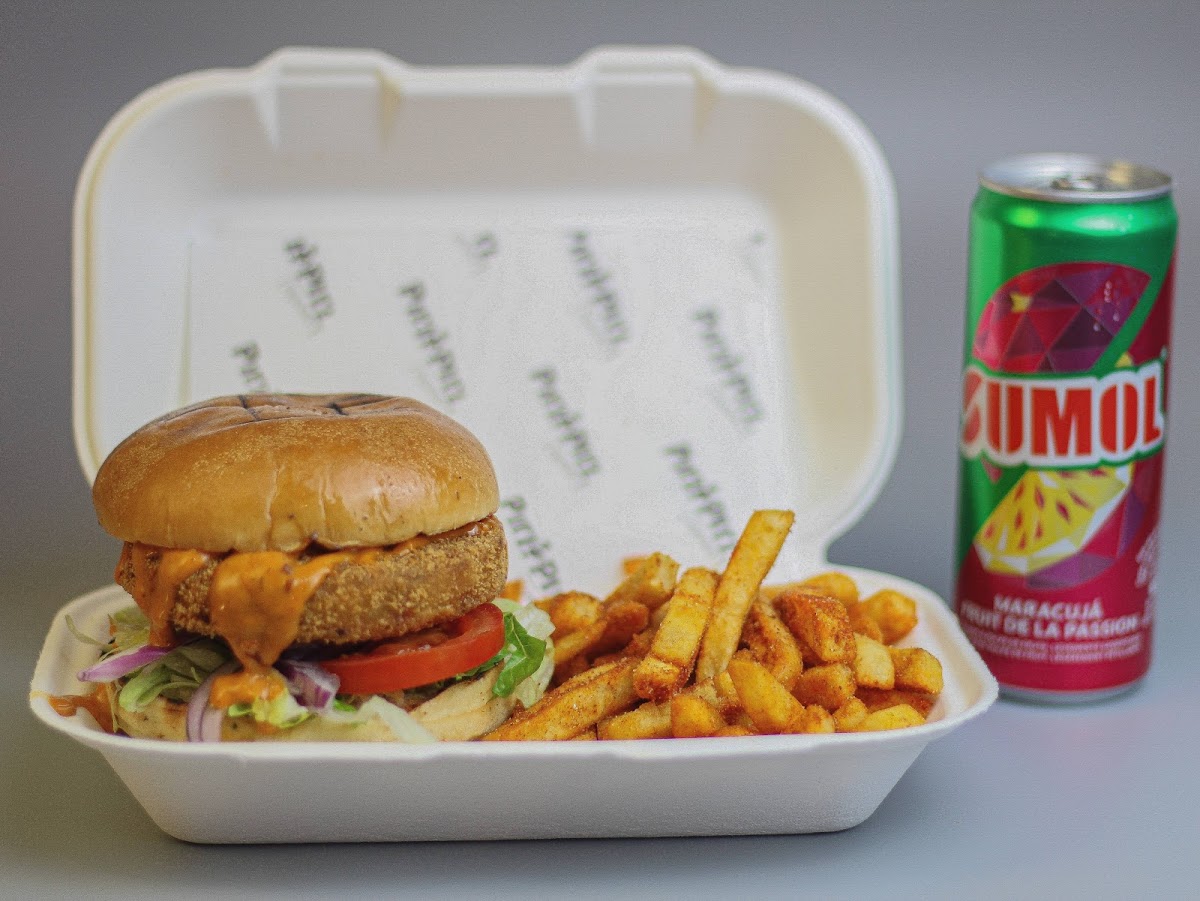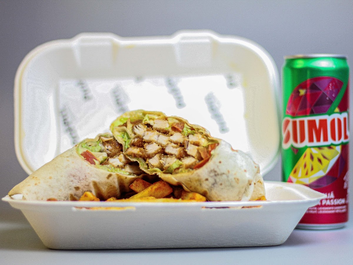 Burger filled with Grilled Breast Fillet, choice of salad and sauce with Chips plus a can of drink